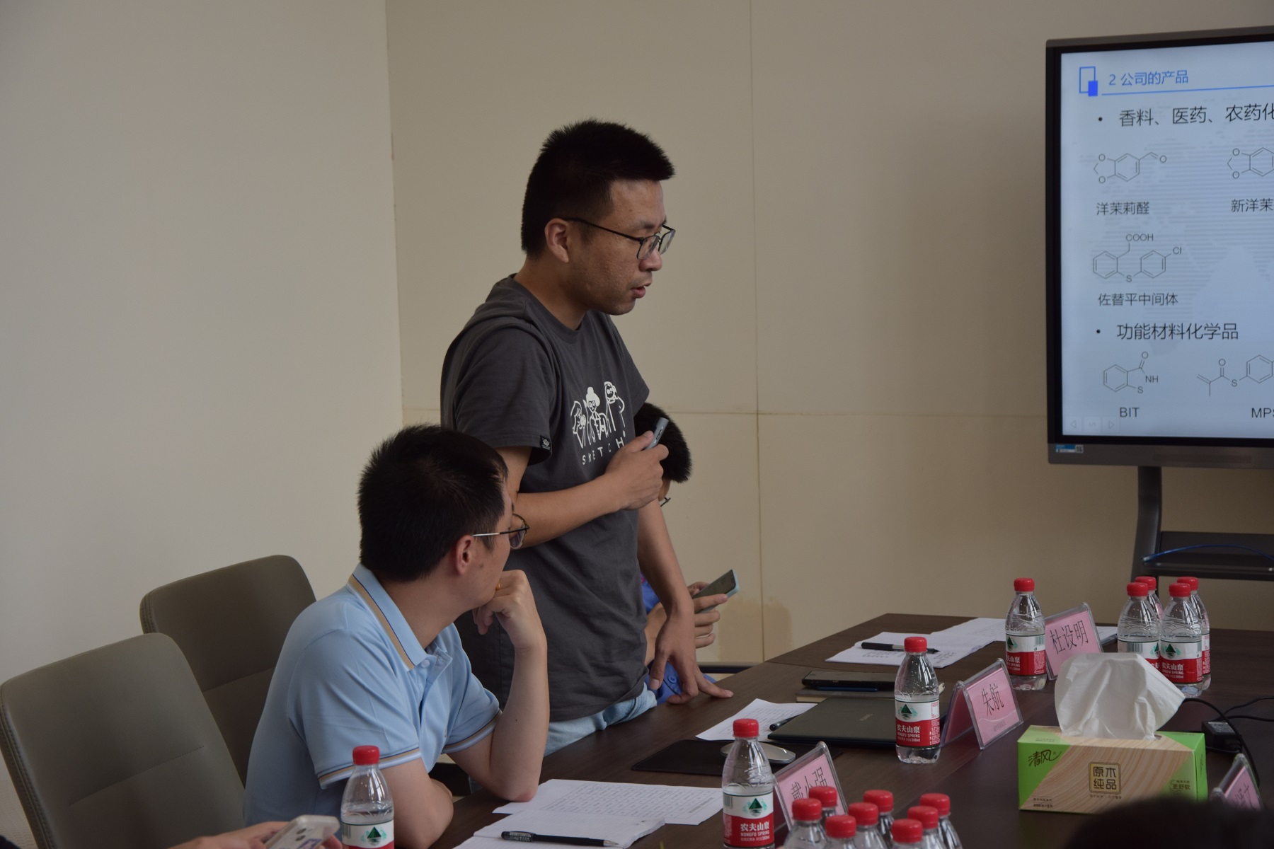 硫磷研究院副院長戴小強帶領(lǐng)新員工熟悉工作環(huán)境,邊走邊介紹實驗室分布及各個項目的發(fā)展情況。