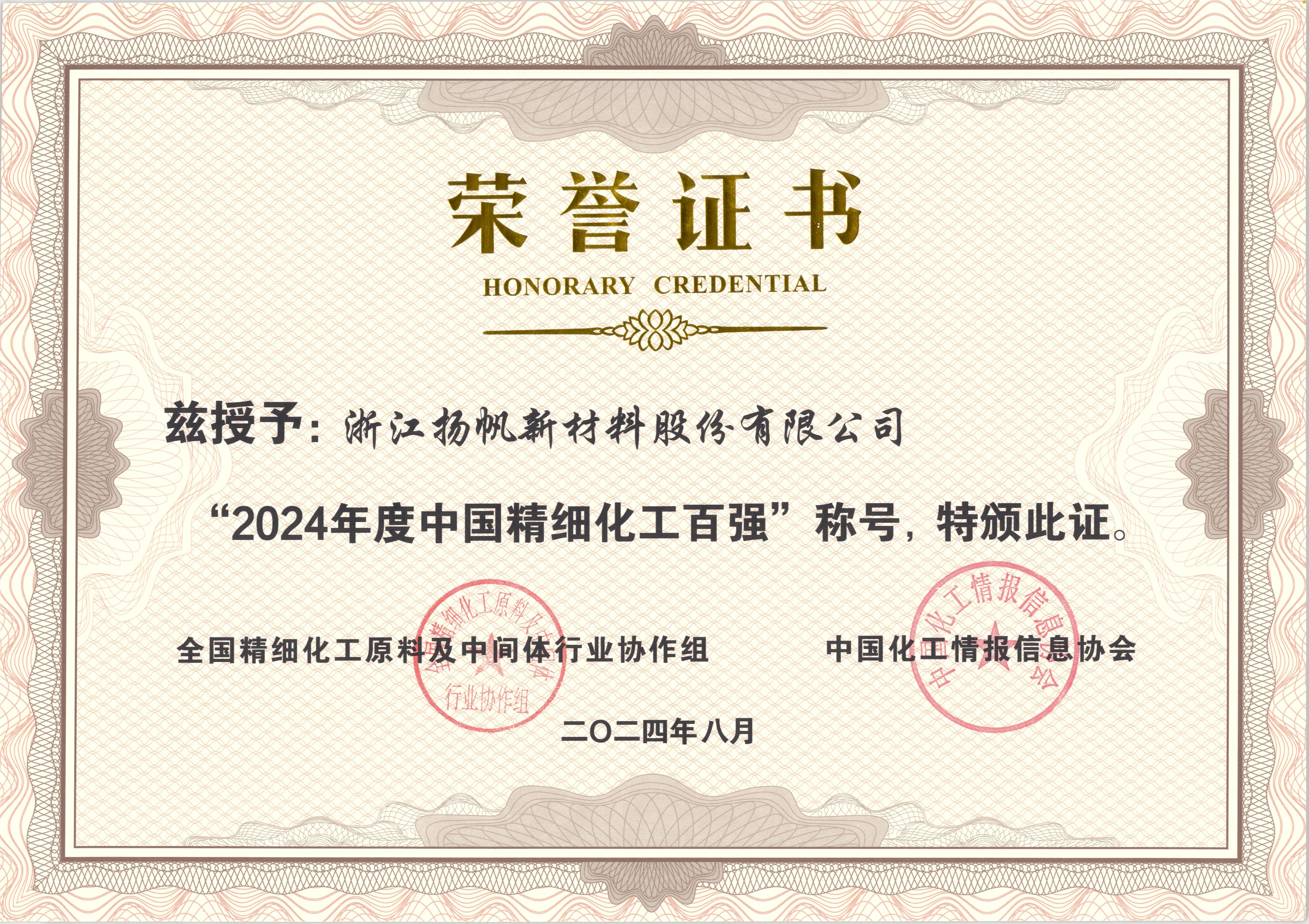 此外,公司榮登“2024年度中國精細化工創(chuàng)新發(fā)展企業(yè)二十強”,位居17位。